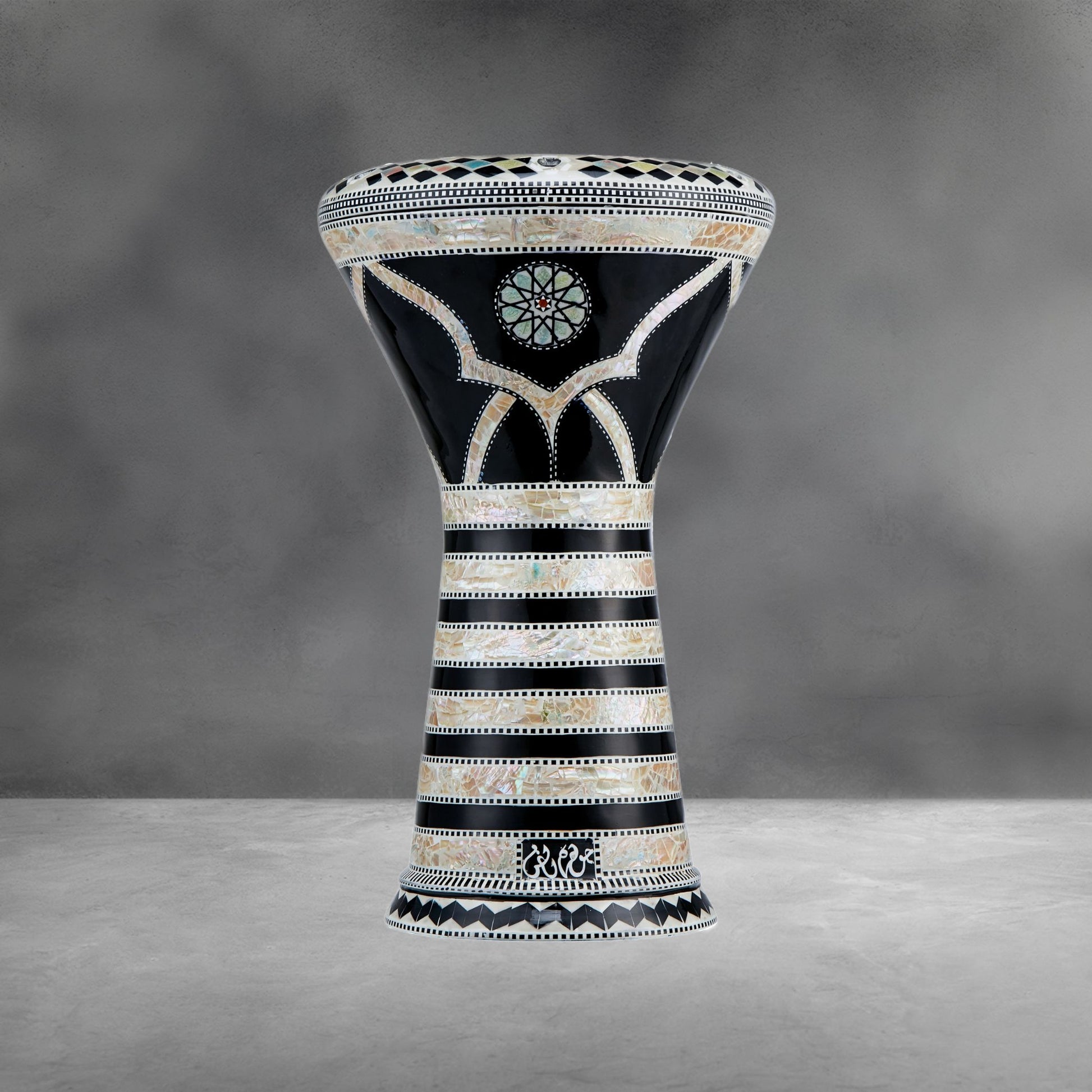 The Pearl Shards Darbuka is one of our most striking and bold designs; this is due, of course, to the black and white designs which you will struggle to find anywhere else on the Darbuka market. There is an eye-catching contrast between the dark and light but the white Mother of Pearl is a soft cream which gives the design a warm finish.