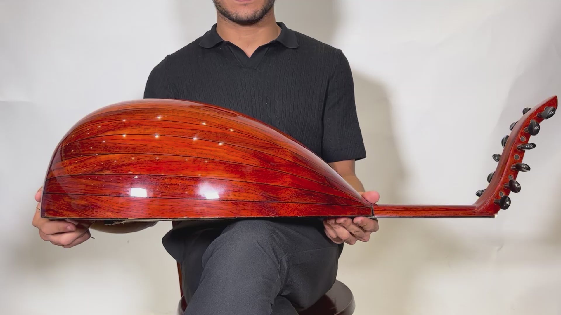Crafted by our finest maker, this premium Rosewood OUD features a handmade Egyptian oud design adorned with real mother of pearl on the face and ebony wood tuning keys. The rosewood back and rich sound make it perfect for professional players seeking a high-quality instrument.