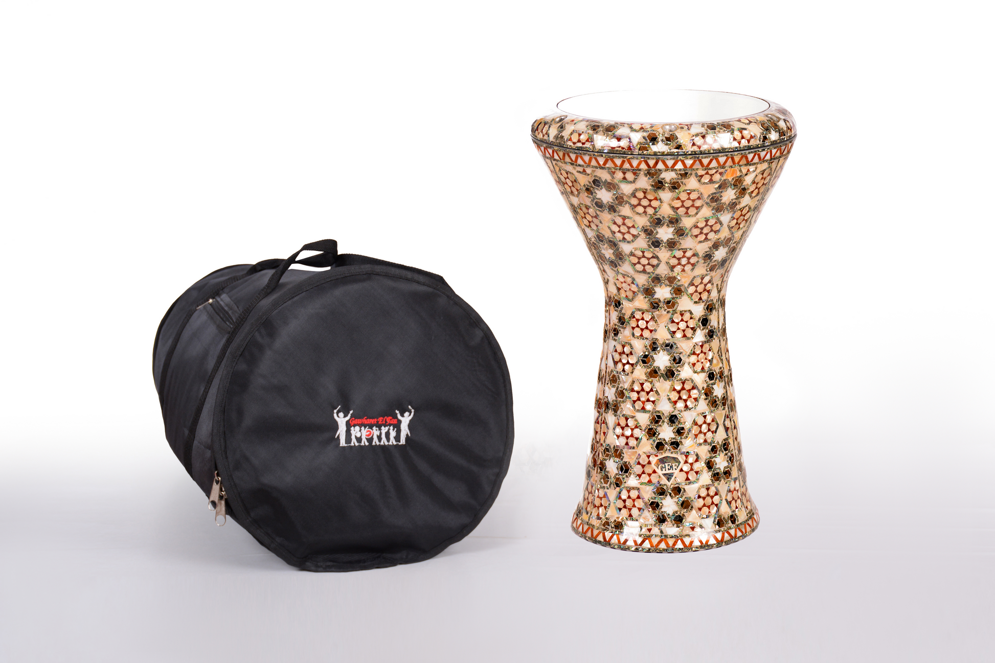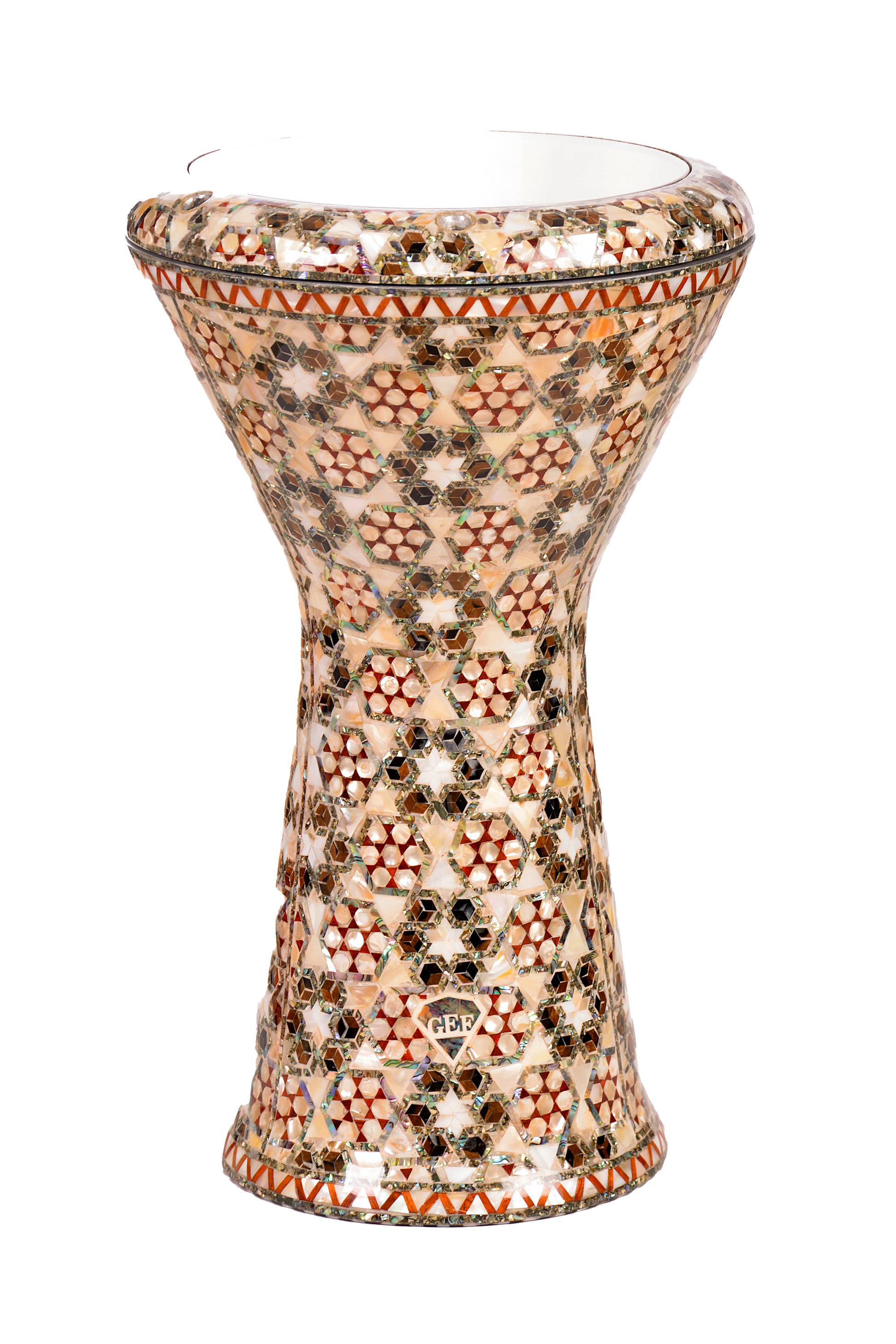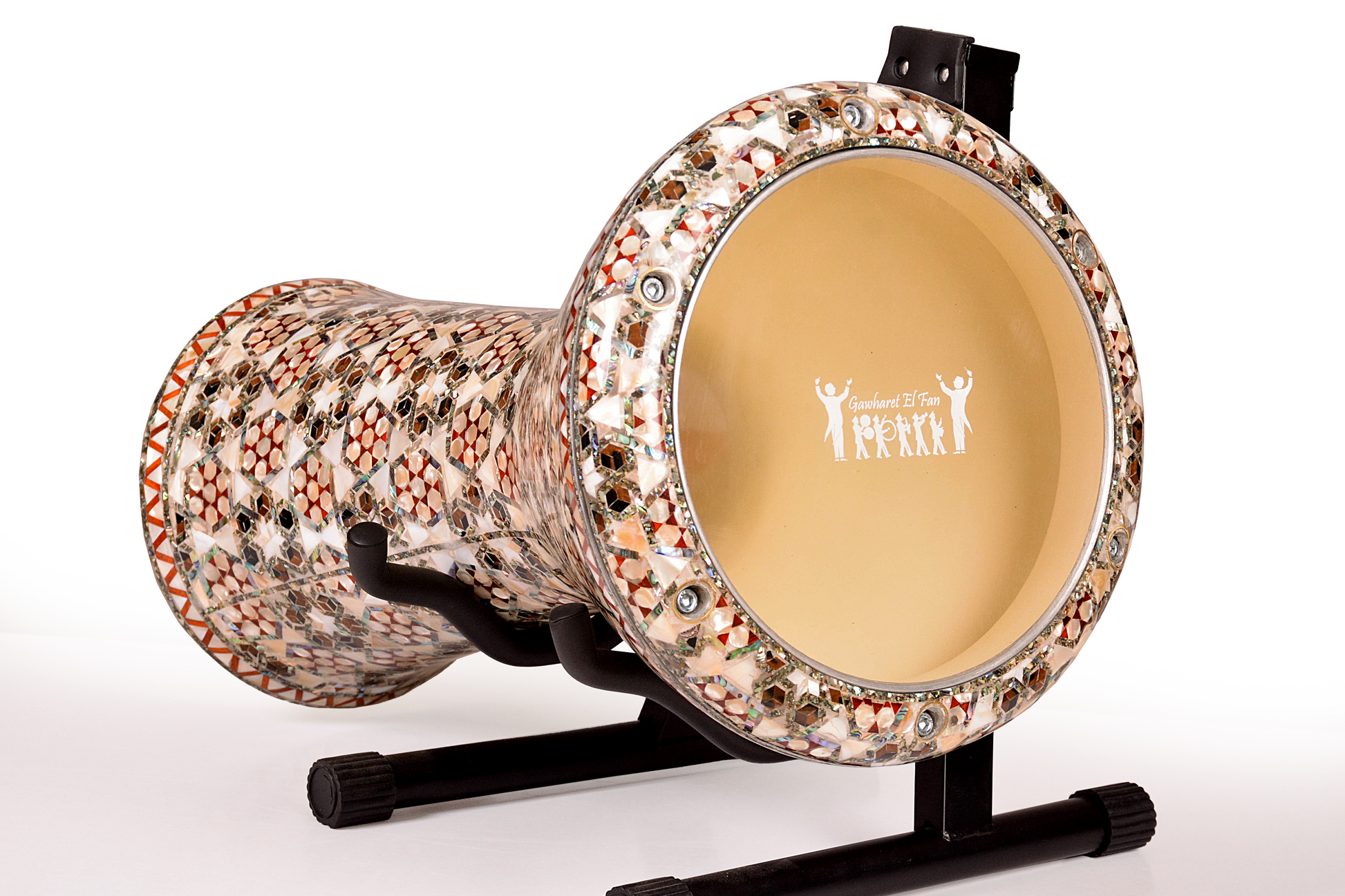 “This is our ultimate high-end collection. It’s a completely customized edition. Starting with the body structure, we’ve designed and developed a brand-new body to meet your expectations and deliver the best sound from this drum. The finish features a groundbreaking technique, never before used in any of our darbukas. The gloss finish inside the drum is as smooth and glossy as the exterior, ensuring perfect sound quality. Our innovative designs incorporate only natural materials to adorn the drum, and this special collection is inlaid with real wood and genuine mother of pearl. You can acquire this exclusive collection through our website or our authorized resellers. We proudly name this collection after Egyptian kings and queens.”
