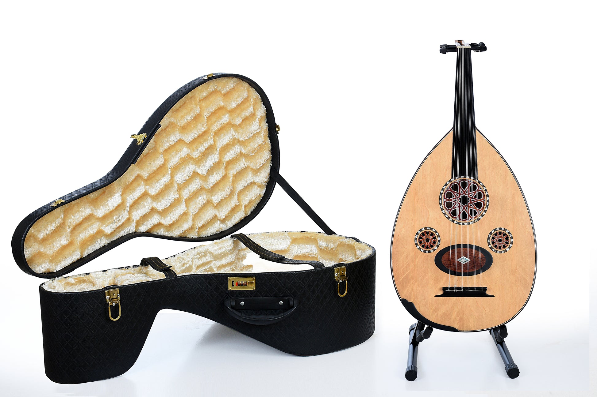 Crafted by our finest maker, this premium Wenge OUD features a handmade Egyptian oud design adorned with cedar wood on the face and ebony wood tuning keys. The Wenge back and rich sound make it perfect for professional players seeking a high-quality instrument.
